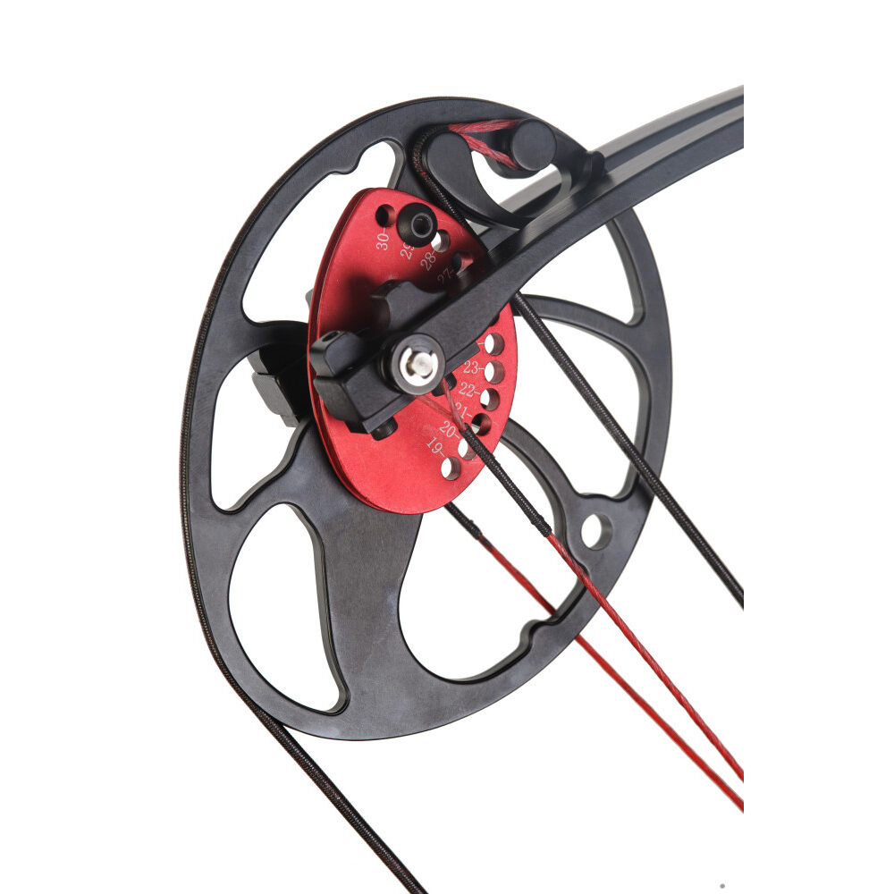 Вид сбоку на блочный лук Боумастер Триумф красно-черной раскраски Охотничий лук Bowmaster Triumph вид сбоку красно-черный Блоки луков для охоты Bowmaster Triumph с поворотным модулем изменения длины растяжки Карман плечей держится на поворотном лимб-болте, в рукоять вставлены виброгасители Резьба под стабилизатор на стальной втулке